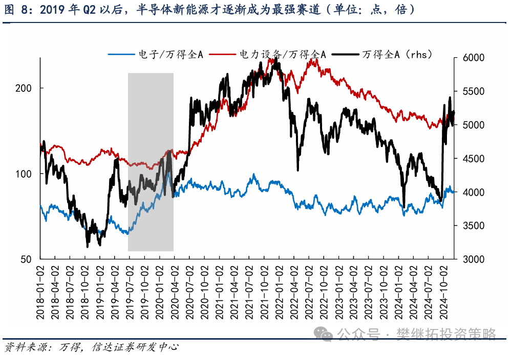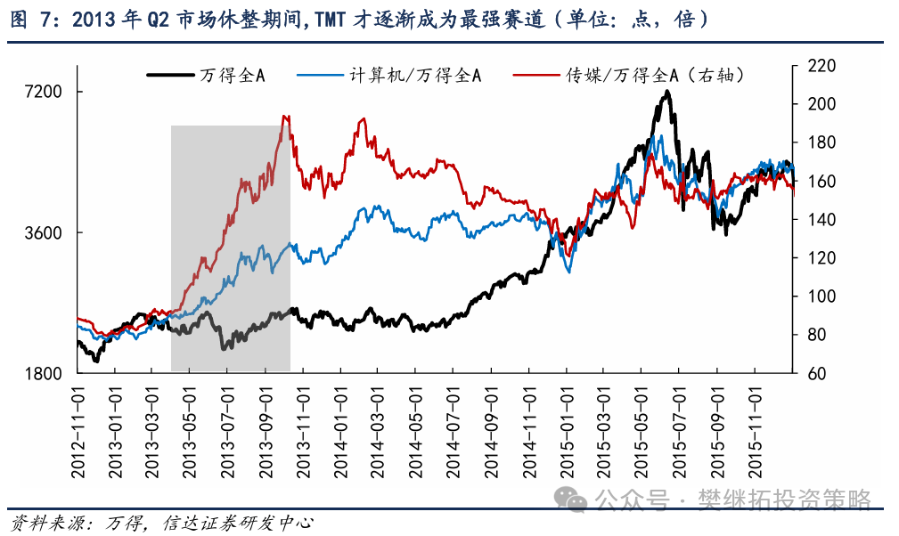 (3)休整过后才会出现牛市最强Alpha赛道:2013年的TMT、2019年的半导体新能源均是在休整后才凸显出来。2013-2015年,最强的产业赛道是TMT,而如果观察传媒和计算机超额收益累积的过程,能够看到,2012年12月-2013年1月,市场刚结束熊市的第一波上涨期间,TMT的超额收益均表现一般。TMT的超额收益主要产生于2013年Q2以后。背后的原因可能是,2012年之前的历次牛市中,TMT都没有过很强的表现,所以牛市来了,投资者最先想到的,买入大概率有超额收益的是银行券商,而不是TMT。而在震荡市,TMT由于基本面优势逐渐凸显出来,才逐渐成长为新一轮牛市最强的赛道。