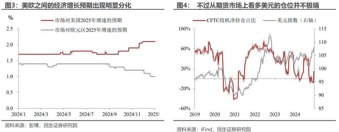 很可能会,但需要一定的时间和契机。毫无疑问,当前美元的升值拥有"天时地利",一方面,特朗普就职就在眼前,只要政策还没有具体落地,就有充分的想象空间——无论是在增长还是通胀方面;另一方面,作为美元最大的“对手方”,欧洲的近况确实不是那么好,既有经济增长上的“痼疾”,也有德法等核心国家政治飘摇带来的不确定性。