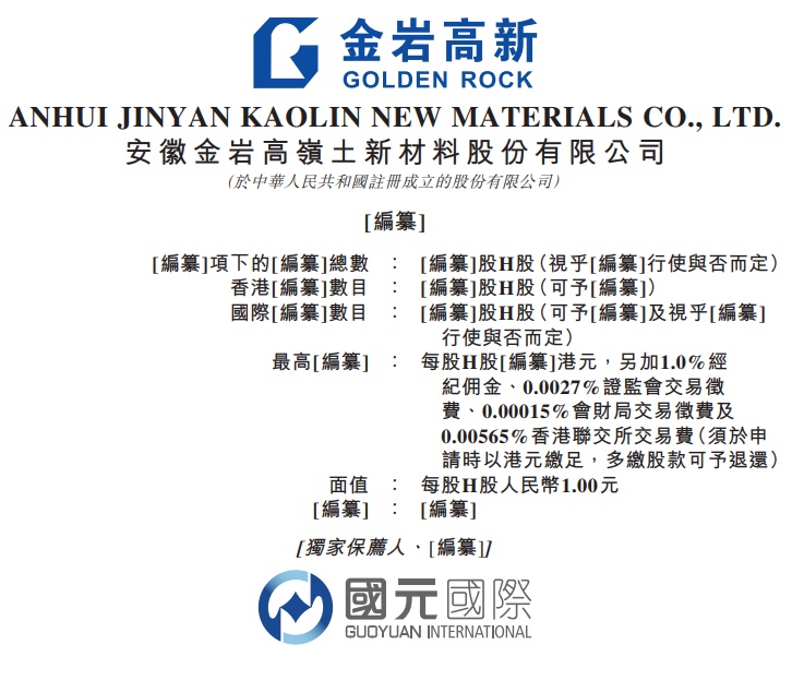 智通财经APP获悉,据港交所1月3日披露,安徽金岩高岭土新材料股份有限公司(简称:金岩高新)向港交所主板提交上市申请书,国元国际为独家保荐人。