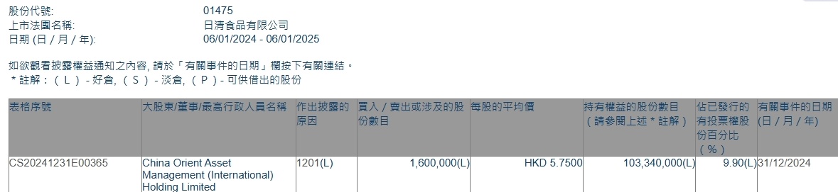 智通财经APP获悉,香港联交所最新资料显示,12月31日,China Orient Asset Management (International) Holding Limited减持日清食品(01475)160万股,每股作价5.75港元,总金额为920万港元。减持后最新持股数目约为1.03亿股,最新持股比例为9.9%。