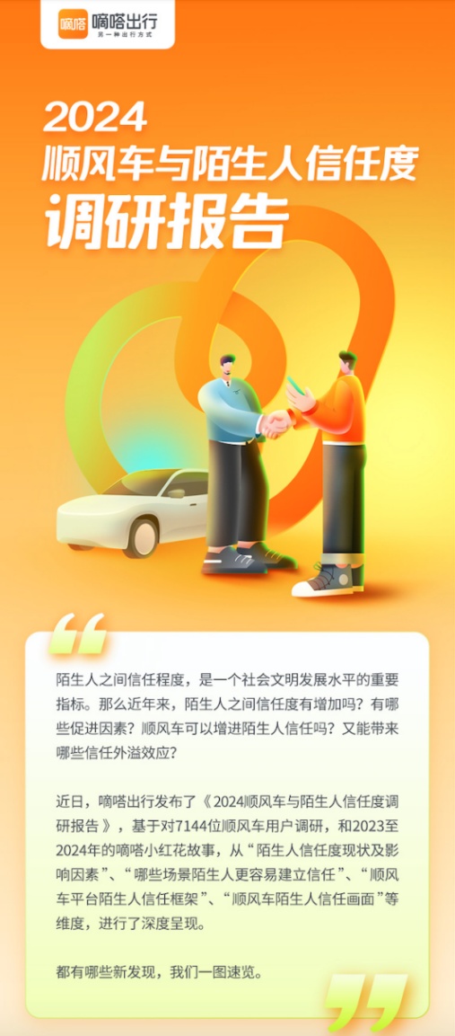 智通财经APP获悉,在10月份,嘀嗒出行(02559)发起顺风车陌生人信任度调研后,得到了全国各地顺风车用户的踊跃参与,共计收到7144份答卷,其中包括数万条文字观点表达,生动展现了当下最新社会文明风貌。基于此,今日,嘀嗒出行正式发布《2024顺风车与陌生人信任度调研报告》,这也是国内共享出行平台首份研究陌生人信任度与社会影响、背后动因、以及与出行场景关系的专项报告。