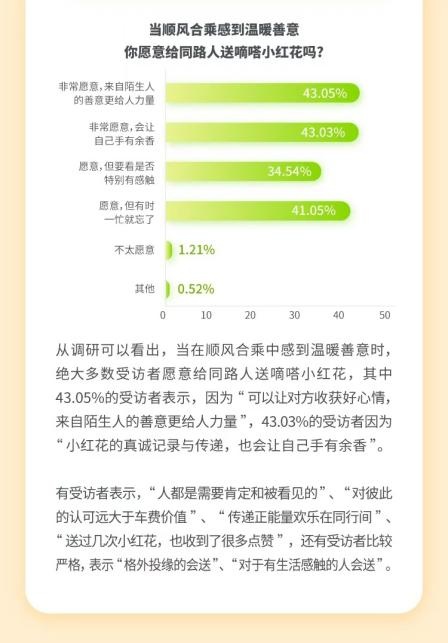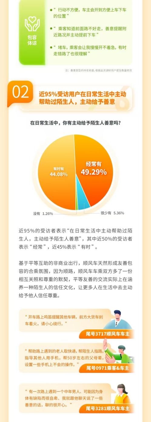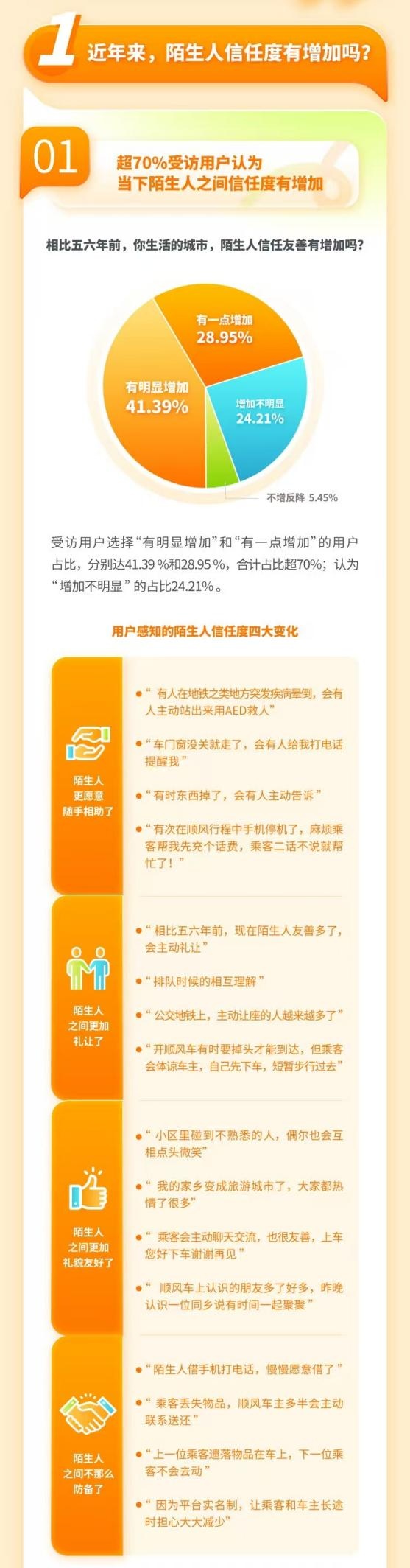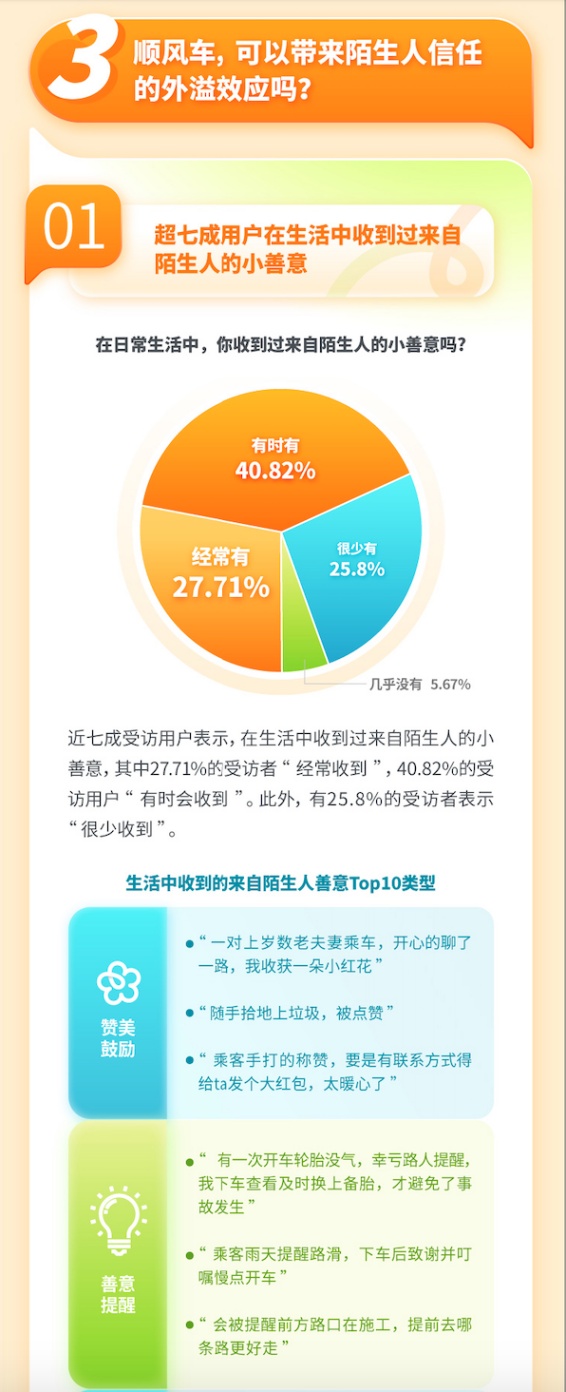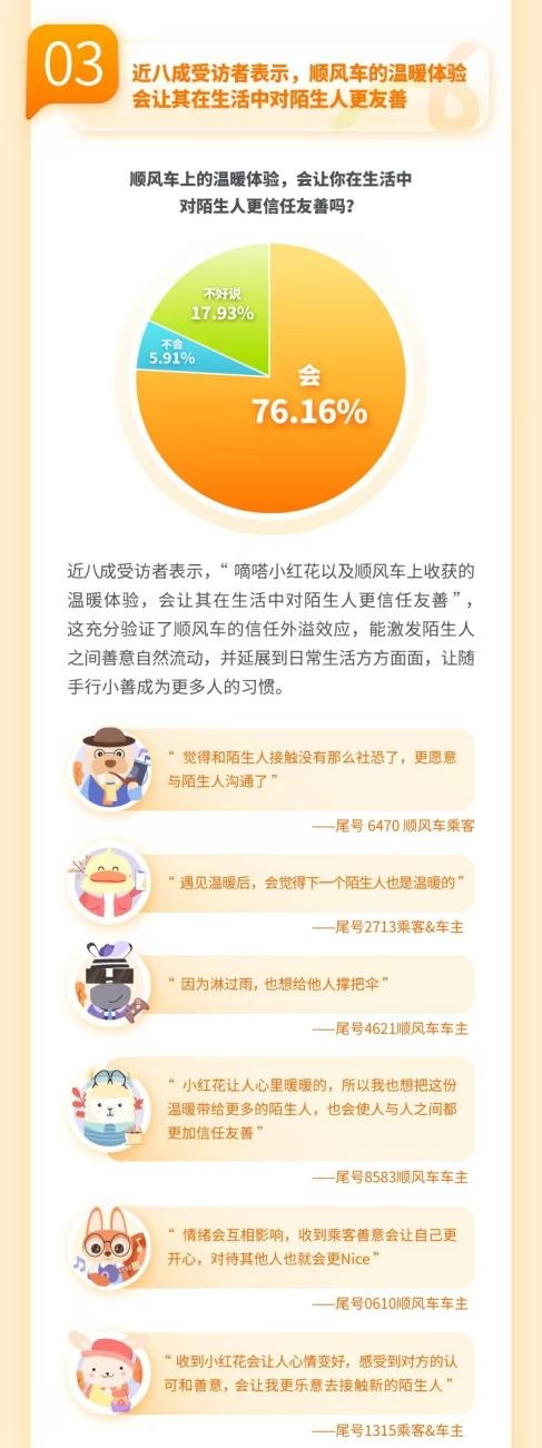 5、超七成收到过陌生人的善意。超八成用户表示,顺风车和小红花的温暖体验会让其对陌生人更信任友善。