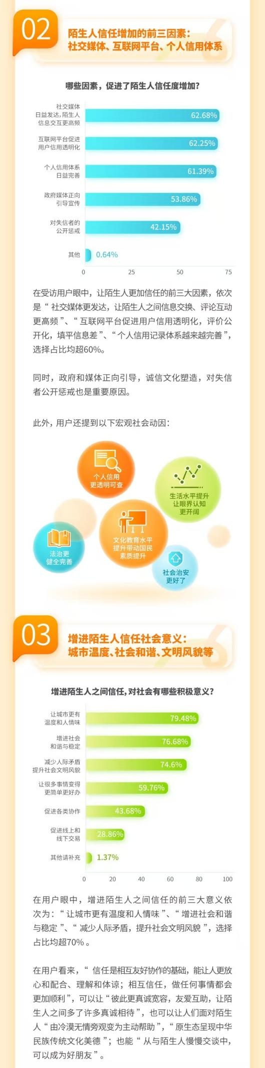 2、超八成用户认为互联网平台有助于增进陌生人信任。而增进陌生人信任前三大意义依次为:让城市更有温度人情味,增进社会和谐稳定、提升社会文明风貌。