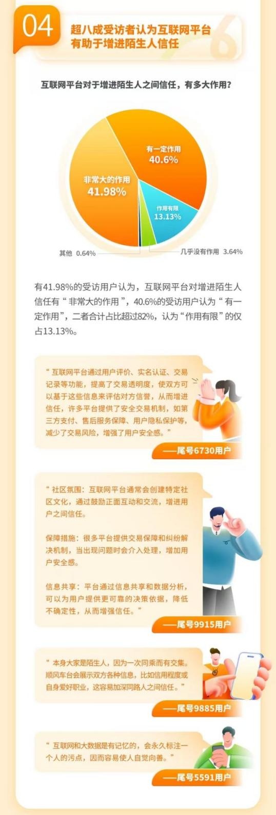 一位认为“有非常大作用”的用户认为,“互联网平台通过用户评价、实名认证、交易记录等功能,提高了交易透明度,使双方可以基于这些信息来评估对方信誉,从而增进信任。许多平台提供了安全交易机制,如第三方支付、售后服务保障、用户隐私保护等,减少了交易风险,增强了用户安全感 ” 。