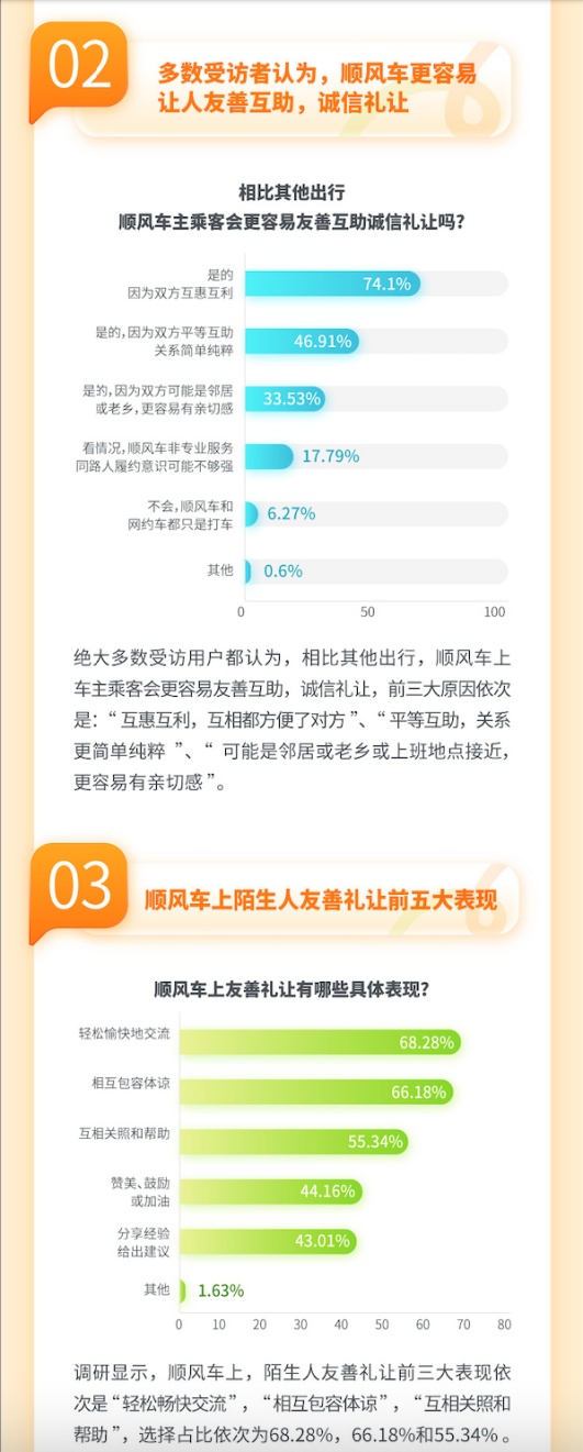 而在顺风车上,陌生人信任友善前三大具体表现,依次是:“轻松畅快交流”,“相互包容体谅”,“互相关照帮助”,受访用户选择占比依次为68.28%,66.18%和55.34%。