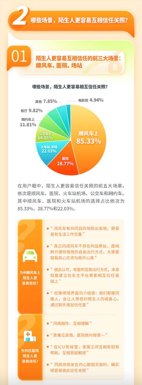 3、陌生人更容易信任的场景前三依次是:顺风车、医院、场站,选择占比依次为85.33%、28.77%、22.03%。顺风车更容易增进陌生人信任的前三理由依次是:互惠互利、车乘关系简单纯粹、更容易有共同话题等。