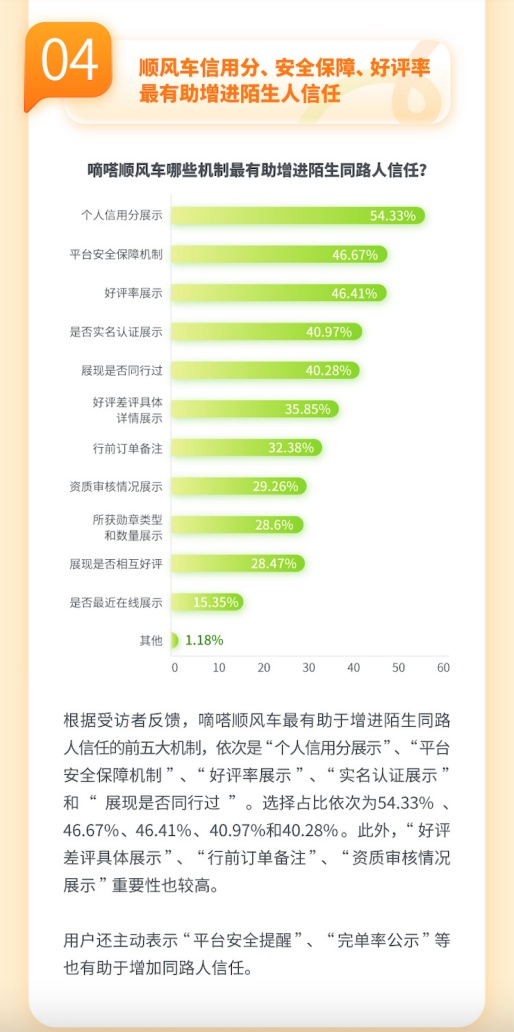 4、顺风车平台增进陌生人信任前五大产品机制:个人信用分展示、平台安全保障机制、好评率展示、实名认证展示和展现是否同行,同时,用户还期待其他信任强化机制,包括展现收到的小红花数量、展现兴趣标签等。