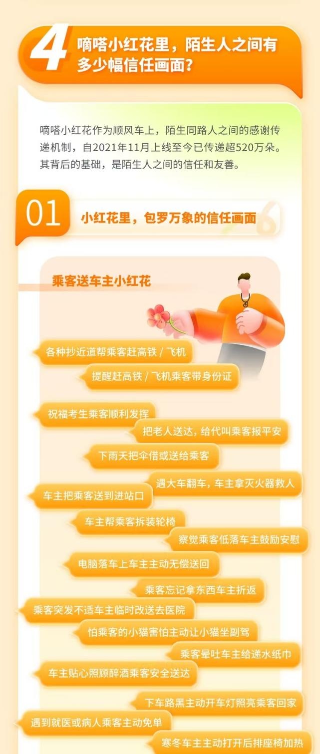 此次报告,还基于2023-2024年嘀嗒小红花故事,总结出了近五十幅 信任画面,分为乘客给车主送花场景、车主给乘客送花场景、以及车主乘客互送三类。其中,互送场景包括互相点赞对方身上的闪光点,互相点赞中国好车主、中国好乘客、互相给予鼓励和祝福、互相表达合乘很愉悦等。这一定程度上印证了,顺风车基于平等互助内核而外化出的独有人文生态。