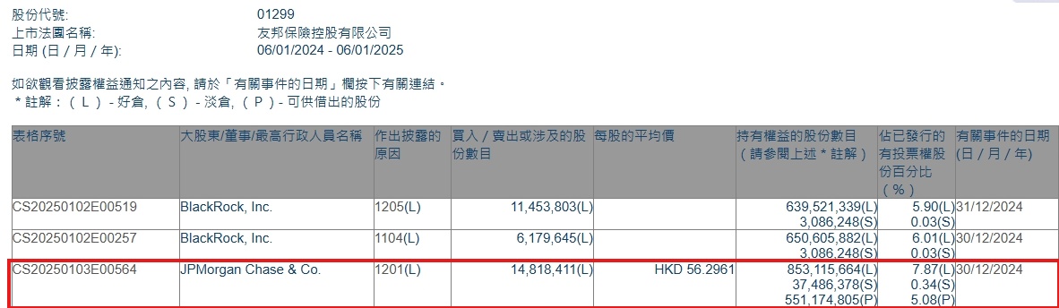 智通财经APP获悉,香港联交所数据显示,12月30日,小摩减持友邦保险(01299)1481.8411万股,每股作价56.2961港元,总金额约为8.34亿港元。减持后最新持股数目约为8.53亿股,持股比例为7.87%。