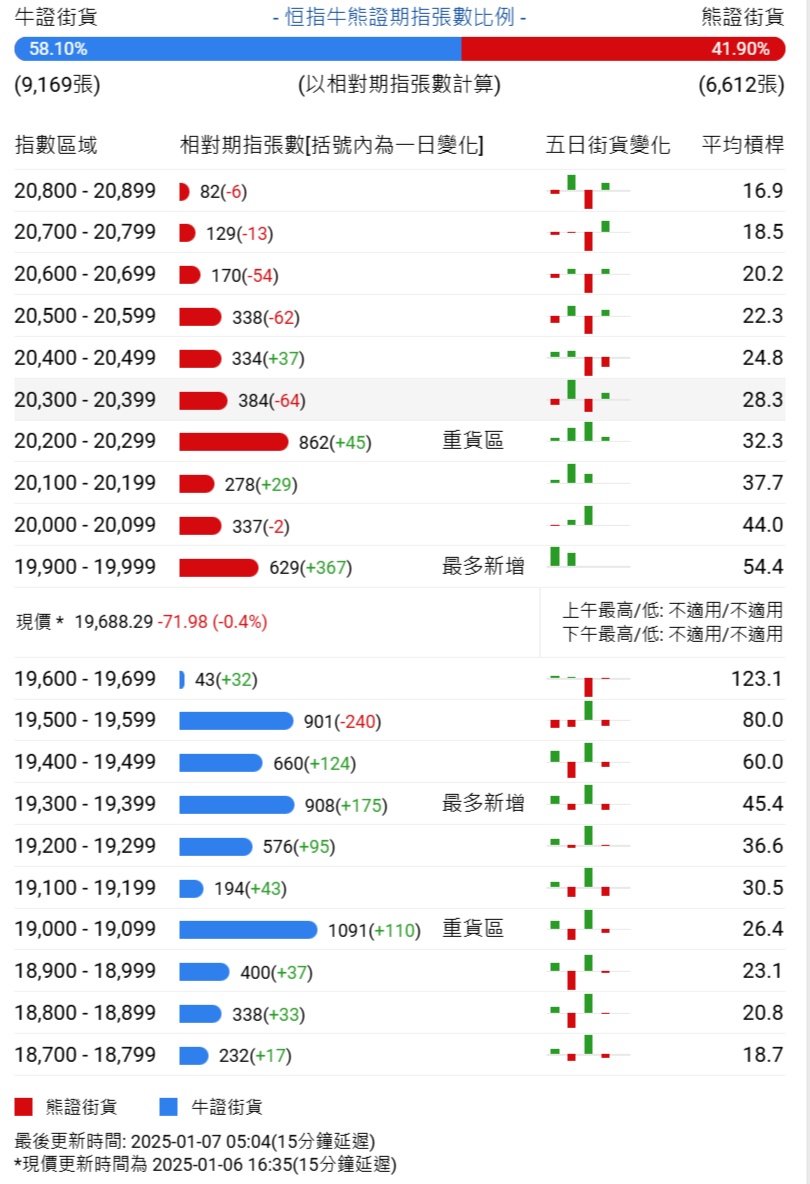 智通财经APP获悉,截至1月7日,恒指最新的牛熊街货比例为58:42。