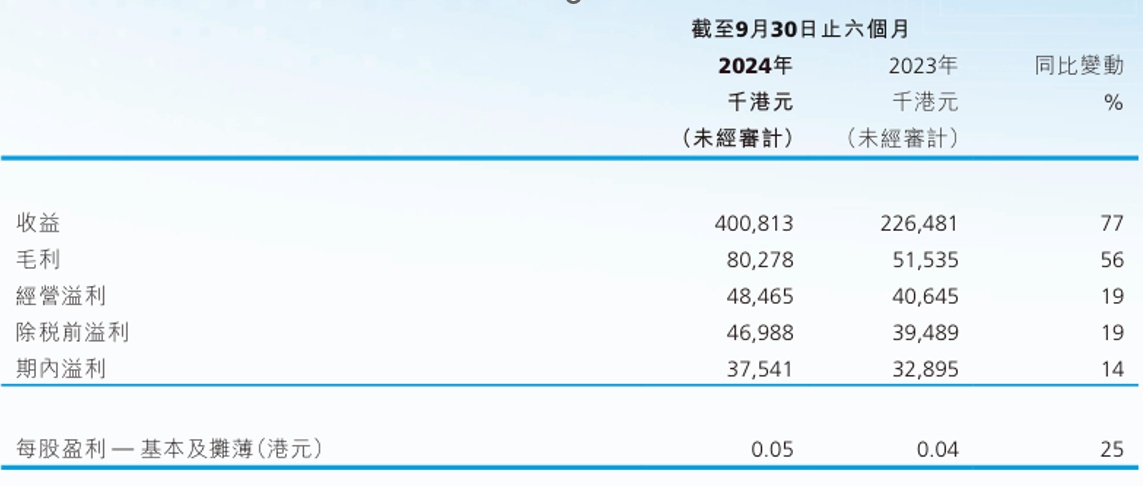 近日,荣利营造公布了截至2024年9月30日止中期报告。数据显示,荣利营造的主要财务指标均有不同幅度的上涨,公司盈利能力持续加强,业务拓展成果颇丰。
