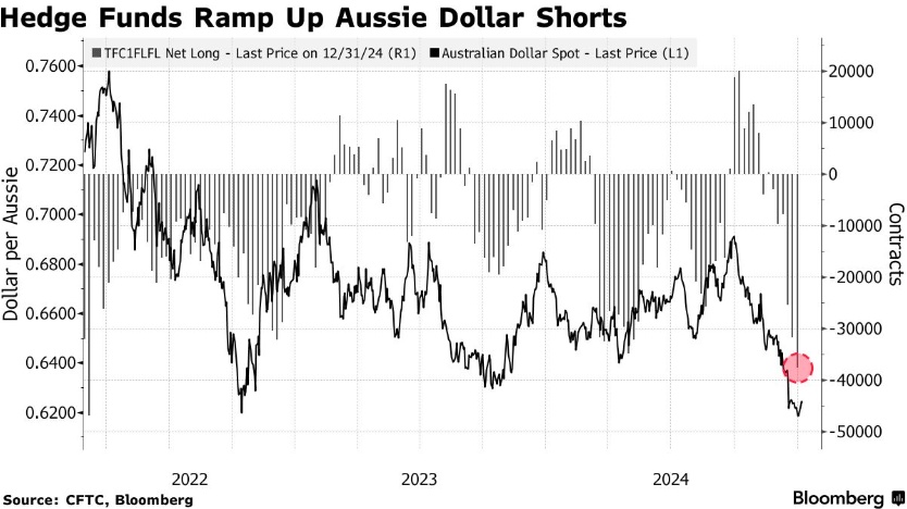 智通财经APP获悉,随着美国关税威胁和海外经济低迷打击澳元,对冲基金正大举押注澳元走弱。美国商品期货交易委员会的数据显示,截至12月31日当周,杠杆基金对澳元的看跌头寸达到了2022年3月以来的最高水平。鉴于澳元对风险情绪变化的敏感性,这些头寸可能还有扩大的空间。