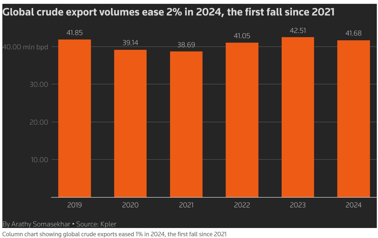 智通财经APP获悉,全球原油出口市场在2024年经历了新冠疫情爆发以来的首次下滑,降幅达2%,这一趋势主要归因于需求增长疲软以及炼油厂和管道布局的变化导致的贸易路线调整。