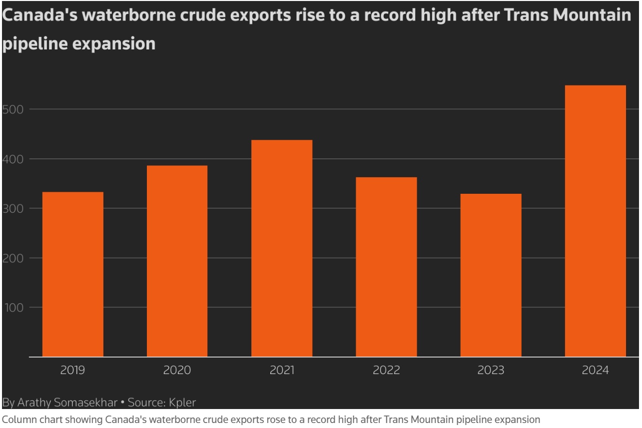 分析师指出,虽然中国是加拿大原油的主要买家,但印度、日本、韩国和文莱也找到了进口商,而且更多的亚洲炼油商可能会购买加拿大原油。分析人士表示,特朗普提议对美国两大外国石油供应国加拿大和墨西哥征收 25% 的关税,这也可能会改变 2025 年的石油流动情况。