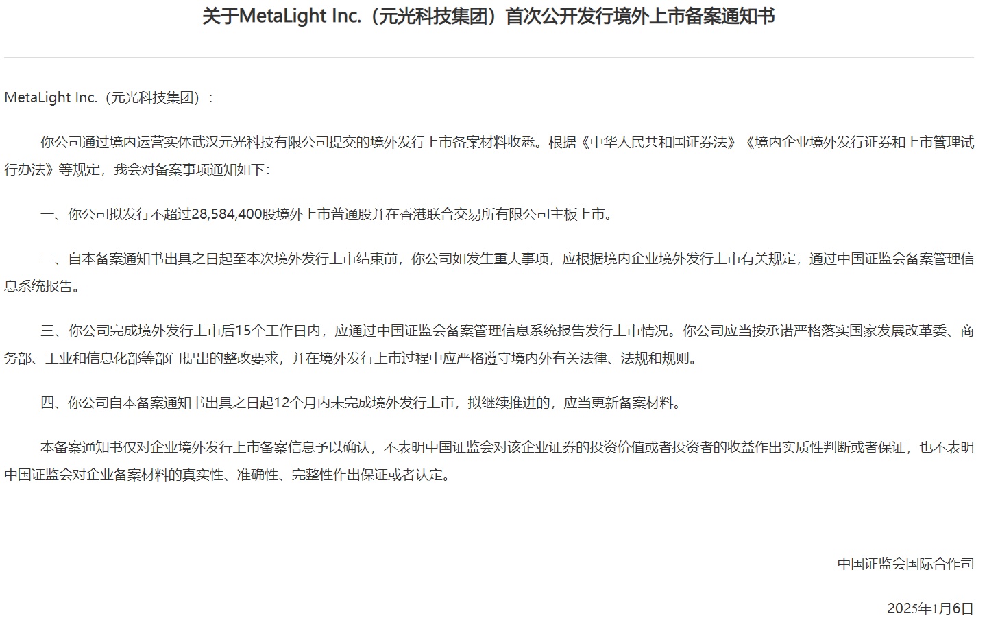 智通财经APP获悉,1月7日,中国证监会国际合作司发布关于MetaLight Inc.(元光科技集团)首次公开发行境外上市备案通知书,该公司拟发行不超过28,584,400股境外上市普通股并在香港联合交易所有限公司主板上市。据港交所2024年12月31日披露,元光科技向港交所主板提交上市申请,中金公司为其独家保荐人。