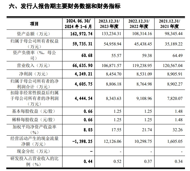 财务方面,招股书显示,于2021年度、2022年度、2023年度、2024年1-6月,信凯科技实现营业收入分别约为12.06亿元、11.92亿元、10.69亿元、6.66亿元。同期,该公司实现净利润分别为8905.91万元、8531.09万元、8454.7万元、4249.21万元。