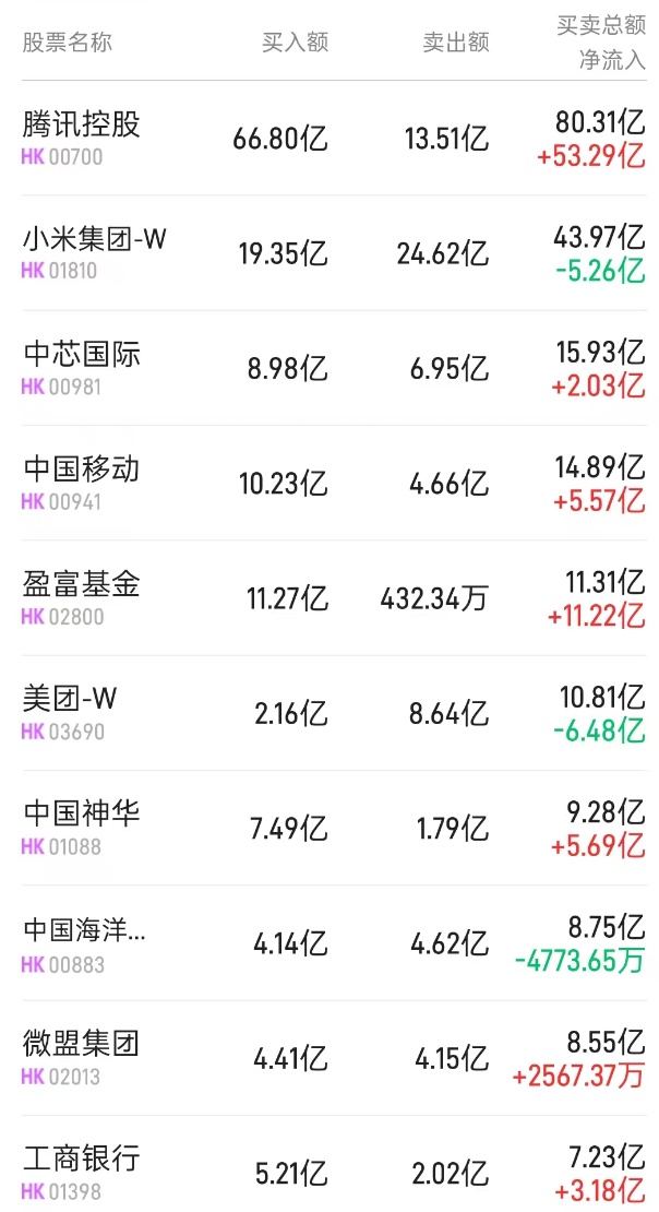 中国移动(00941)获净买入4.97亿港元。消息面上,国元证券指出,无线通信迭代降速,运营商资本开支更趋温和。央企负责人的考核制度的持续优化,新兴业务拓展持续加速。三大运营商在传统C+H端业绩整体稳健的情况下,新兴业务成为新动能,叠加精细化管理推进下的费率优化与更为谨慎的资本开支,预计未来运营商的业绩将呈更好表现。同时,中国移动、中国电信、中国联通给与的派息率指引持续上行。低利率环境下运营商的股息率亦有较好配置价值。