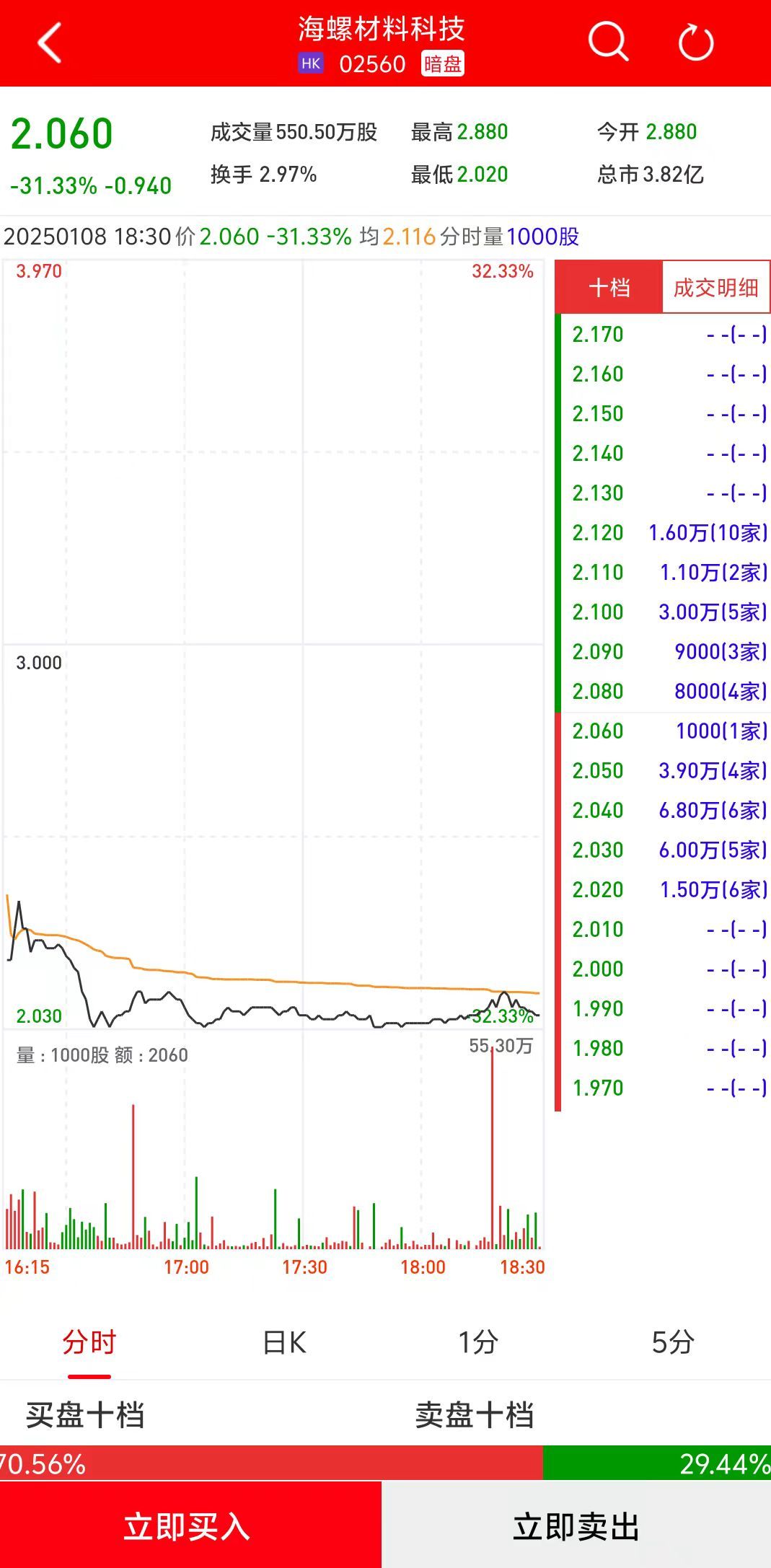 智通财经APP获悉,海螺材料科技(02560)将于1月9日(周四)在香港挂牌。截至收盘,利弗莫尔证券暗盘交易显示报价2.06港元,较招股价3港元下跌31.33%,每手1000股,不计手续费,每手亏940港元。