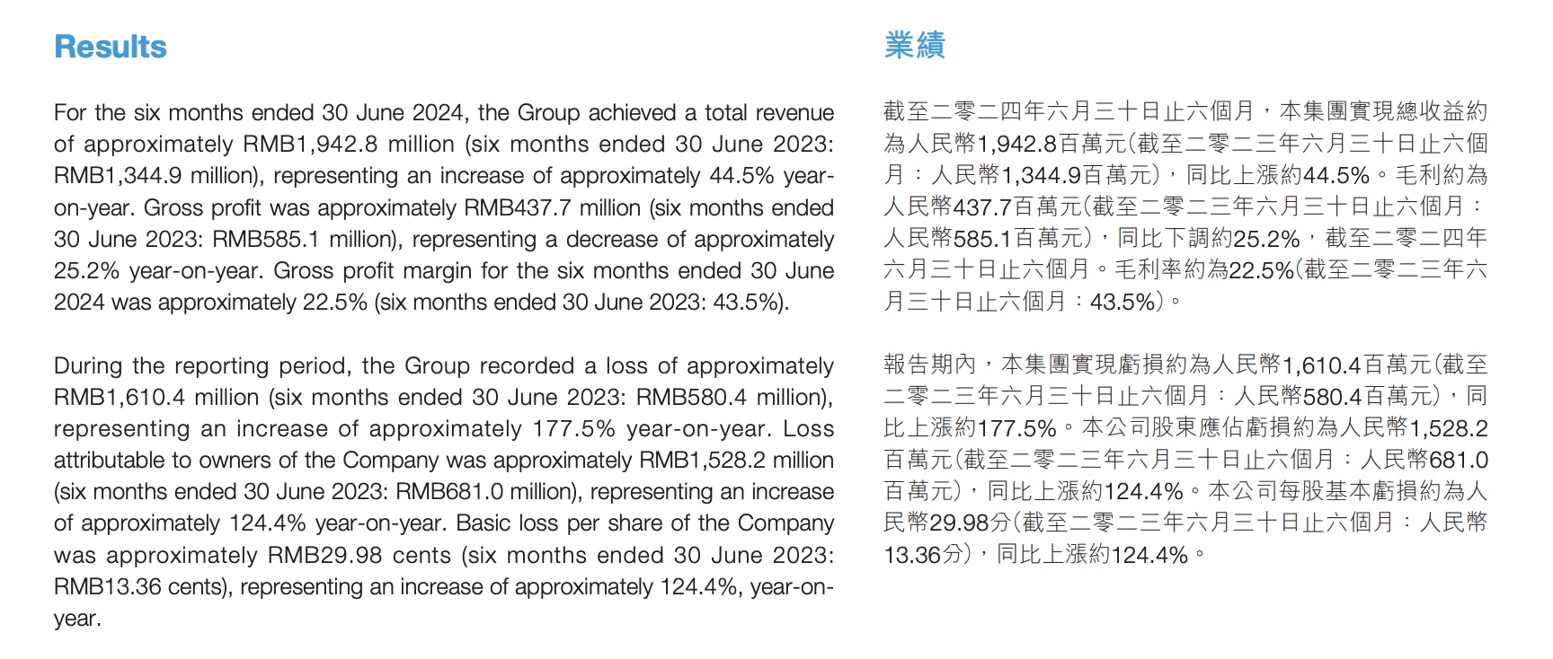 从经营层面来看,受大环境及行业发展状况影响,绿景中国近年来经营持续下行。从2022年开始公司每年均为亏损,2023年全年亏损更超过21亿。2024年上半年,绿景中国收入虽然同比增长,但毛利率下滑明显。该报告期内绿景中国6个月的亏损已达到16.1亿元,较上年度的亏损5.8亿元大幅增加。