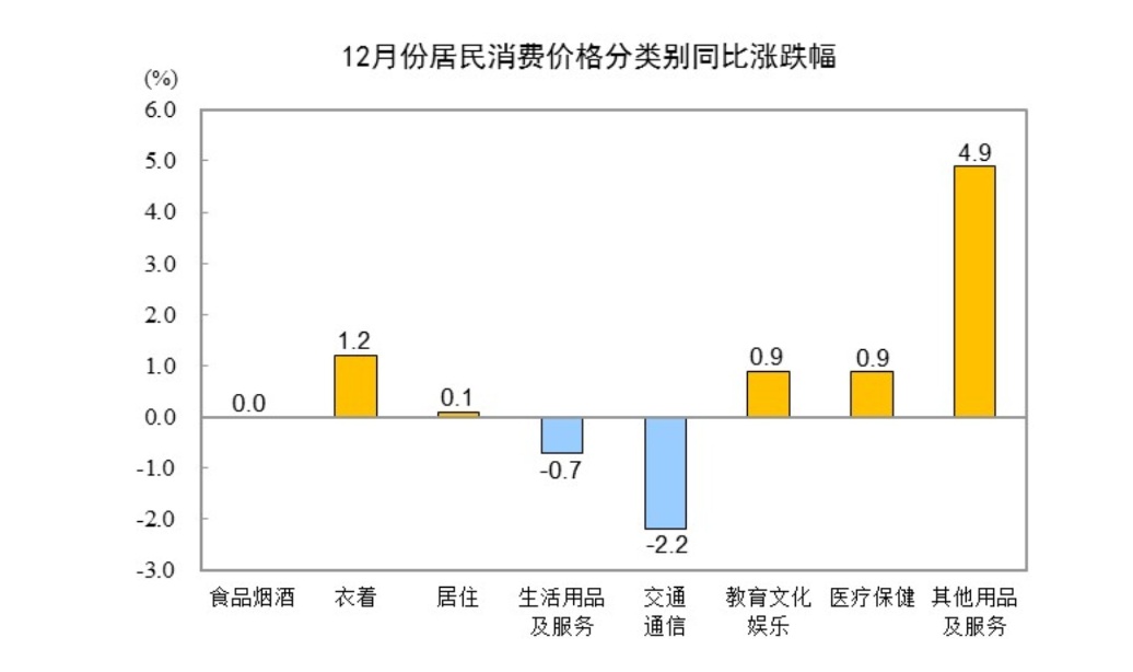 12月份,食品烟酒类价格环比下降0.3%,影响CPI下降约0.09个百分点。食品中,鲜菜价格下降2.4%,影响CPI下降约0.05个百分点;畜肉类价格下降1.3%,影响CPI下降约0.04个百分点,其中猪肉价格下降2.1%,影响CPI下降约0.03个百分点;鲜果价格下降1.0%,影响CPI下降约0.02个百分点。