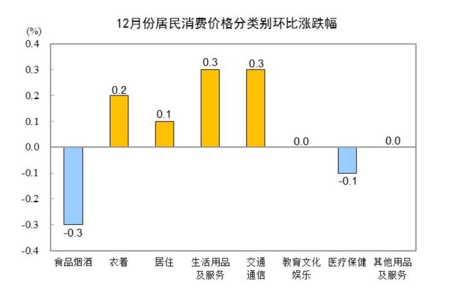 12月份,全国居民消费价格环比持平。其中,城市持平,农村下降0.1%;食品价格下降0.6%,非食品价格上涨0.1%;消费品价格下降0.1%,服务价格上涨0.1%。