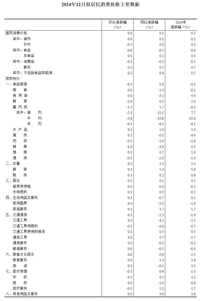 2024年12月份,全国居民消费价格同比上涨0.1%。其中,城市上涨0.1%,农村持平;食品价格下降0.5%,非食品价格上涨0.2%;消费品价格下降0.2%,服务价格上涨0.5%。