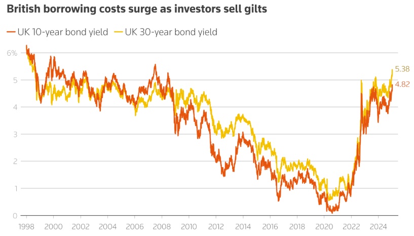 智通财经获悉,尽管近几个月来英国债券收益率一直在攀升,但市场的焦虑情绪本周开始加剧,长期以来对通胀和工党支出计划的担忧触动了人们的神经。周三,英国国债收益率突破数十年高点,英国10年期国债收益率飙升至2008年以来最高,英国30年期国债收益率升至1998年以来最高。由于美国对即将上任的美国总统特朗普的减税和关税政策的类似担忧正在升温,市场担忧情绪进一步加剧。