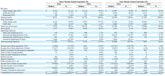 截至2024年9月30日的三个月里,太阳能和电池销量的下降反映出完成的太阳能系统数量减少了56.0%,部署的瓦数减少了71.4%。