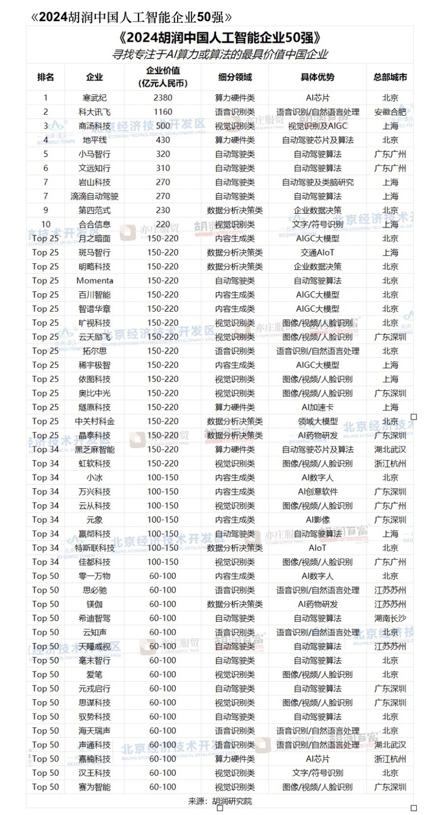 智通财经APP获悉,1月9日,胡润研究院于北京首次发布《2024胡润中国人工智能企业50强》。成立于2016年、总部在北京的AI芯片企业寒武纪(688256.SH)以2380亿(人民币,下同)的价值位居榜首,智能语音企业科大讯飞(002230.SZ)以1160亿的价值排名第二,机器视觉和大模型企业商汤科技(00020)以500亿的价值排名第三。