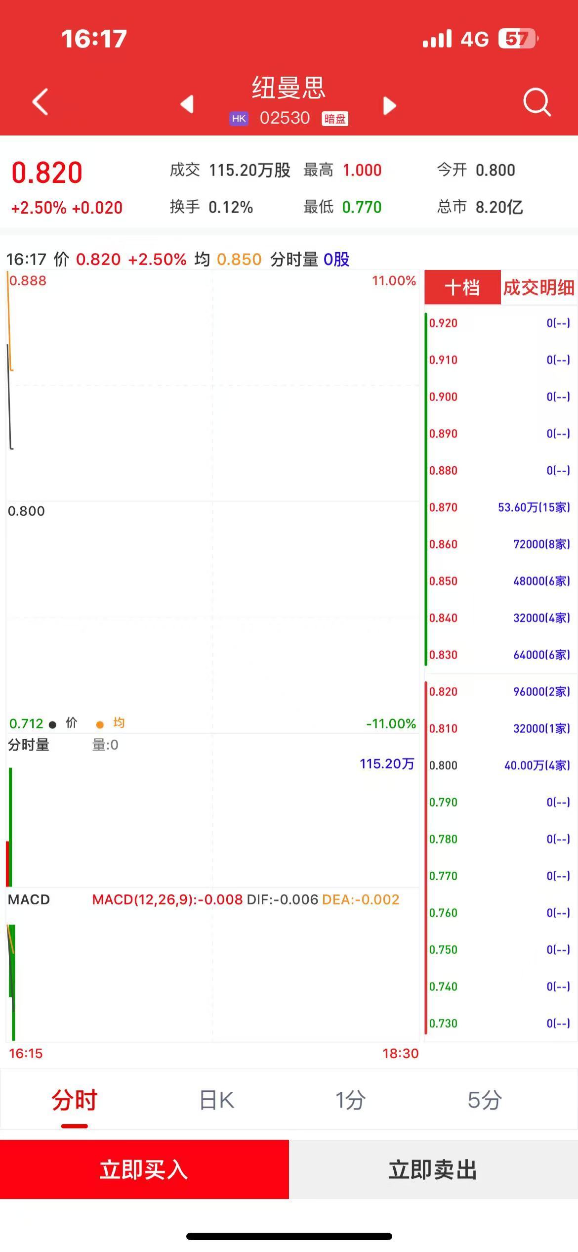 智通财经APP获悉,纽曼思(02530)将于1月10日(周五)在香港挂牌。截至发稿,利弗莫尔证券暗盘交易显示报价0.82港元,较招股价0.80港元上涨2.50%,每手8000股,不计手续费,每手赚160港元。