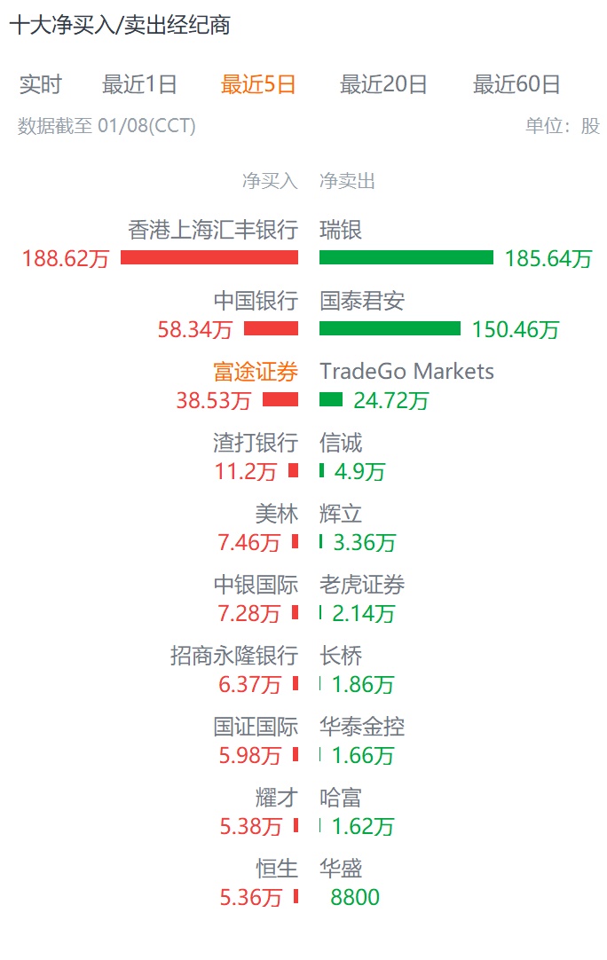 但在最近5日,净买入最多的是汇丰银行、中国银行和富途证券,分别净买入188.62万股、58.34万股、38.53万股;净卖出最多则是瑞银、国泰君安和TradeGo,分别净卖出185.64万股、150.46万股和24.72万股。
