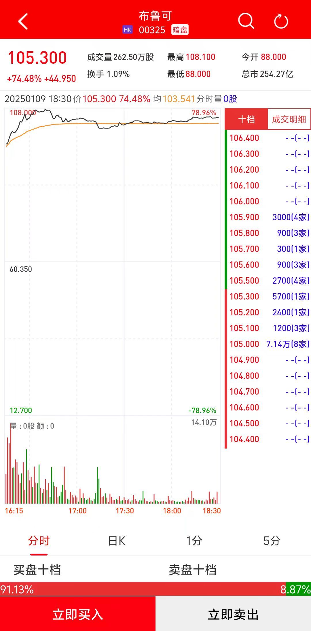 智通财经APP获悉,布鲁可(00325)将于1月10日(周五)在香港挂牌。截至收盘,利弗莫尔证券暗盘交易显示报价105.3港元,较招股价60.35港元上涨74.48%,每手300股,不计手续费,每手赚13485港元。