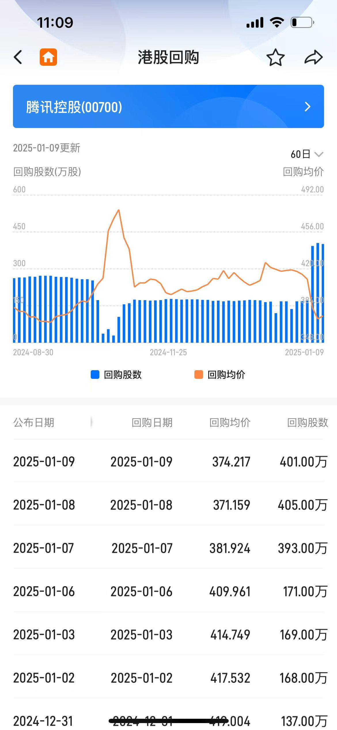 在股价回调之际,腾讯控股加大了回购力度。数据显示,从2025年1月7日开始,腾讯控股港股回购金额已连续3个交易日均保持在15亿元港元左右,较此前交易日的回购金额提升超过1倍。在此前的数个交易日,腾讯控股的日回购金额在7亿港元左右。