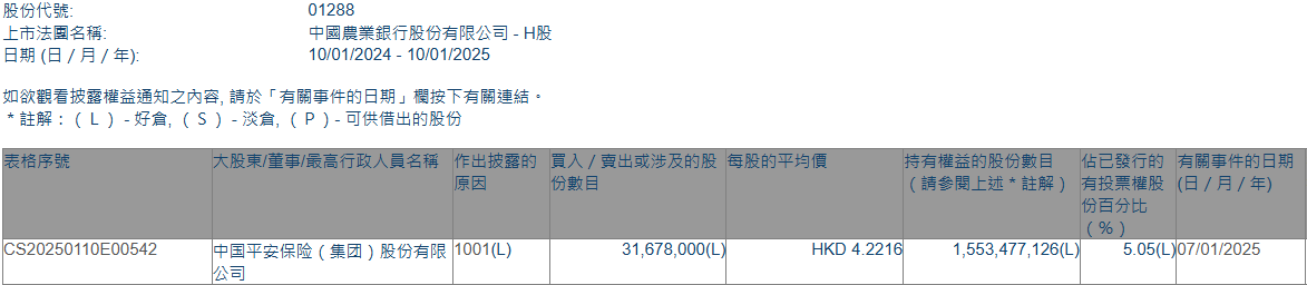 智通财经APP获悉,香港联交所最新资料显示,1月7日,中国平安保险(集团)股份有限公司增持农业银行(01288)3167.8万股,每股作价4.2216港元,总金额约1.34亿港元。增持后最新持股数目约为15.53亿股,最新持股比例为5.05%。