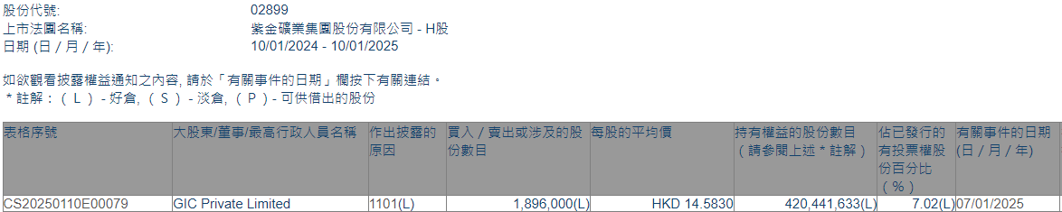 智通财经APP获悉,香港联交所最新资料显示,1月7日,GIC Private Limited增持紫金矿业(02899)189.6万股,每股作价14.5830港元,总金额约为2764.94万港元。增持后最新持股数目约为4.20亿股,最新持股比例为7.02%。