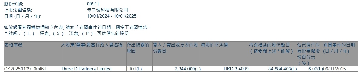 智通财经APP获悉,香港联交所最新资料显示,1月6日,Three D Partners Limited增持赤子城科技(09911)234.4万股,每股作价3.4039港元,总金额约为797.87万港元。增持后最新持股数目约为8488.44万股,最新持股比例为6.02%。