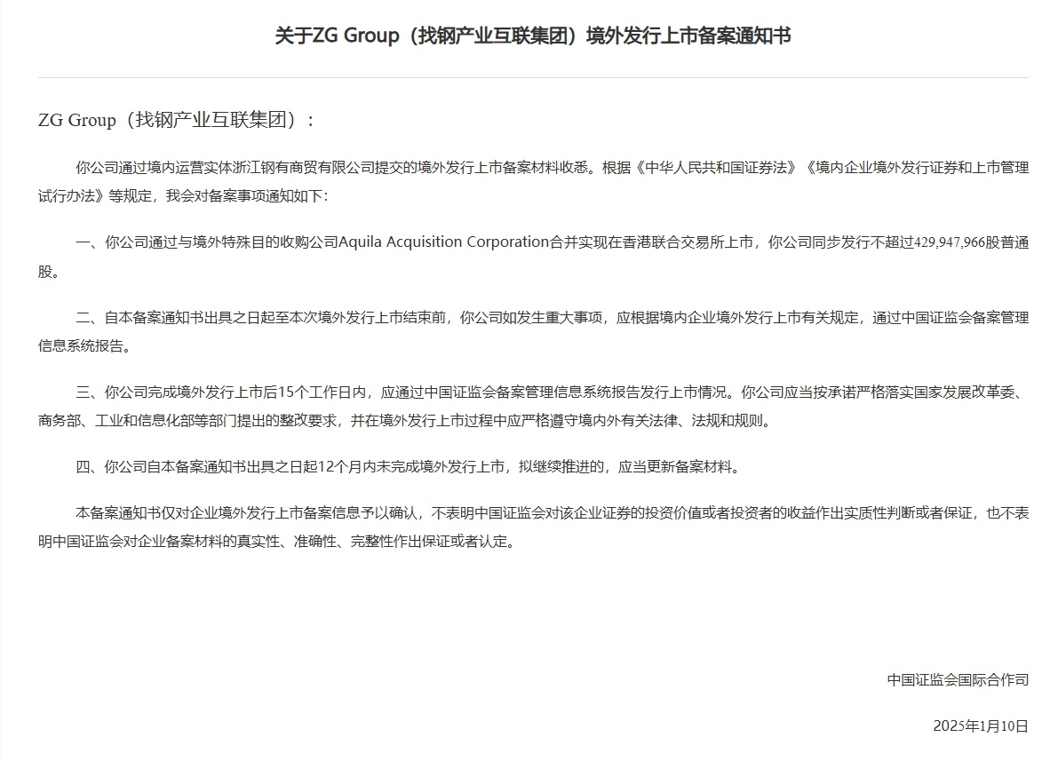 智通财经APP获悉,1月10日,中国证监会发布关于ZG Group找钢产业互联集团(简称“找钢网”)境外发行上市备案通知书,公司拟通过与境外特殊目的收购公司Aquila Acquisition Corporation同步发行不超过约4.3亿股境外上市普通股,并在香港联合交易所上市。