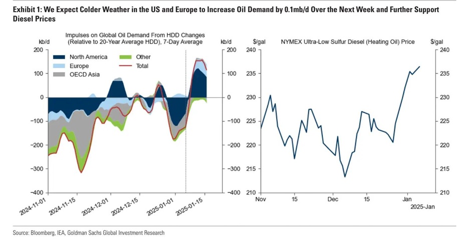 高盛在近日发布的一份研报中表示,上周,布伦特原油价格出现上涨,主要原因是美国东北部和欧洲的寒冷天气支撑了取暖用油的强劲需求。同时,经合组织石油商业库存的最新预测显示,库存量已降至比去年同期低3000万桶的水平。此外,油价首次突破100日移动均线,触发了算法交易,进一步推高了油价。高盛预计,近期美国与西北欧地区的气温大幅下降将使石油需求增加10万桶/日,这尤其将进一步支撑柴油价格走势。自12月初的低点以来,柴油价格已经回升了10%以上。