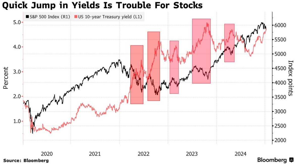 交易员们正在关注政策敏感的10 年期美国国债收益率,该收益率创下 2023 年 10 月以来的最高水平,并迅速接近 5%,他们担心这一水平可能引发股市回调。该收益率上一次短暂突破这一门槛是在 2023 年 10 月,而在此之前,你必须追溯到 2007 年 7 月。