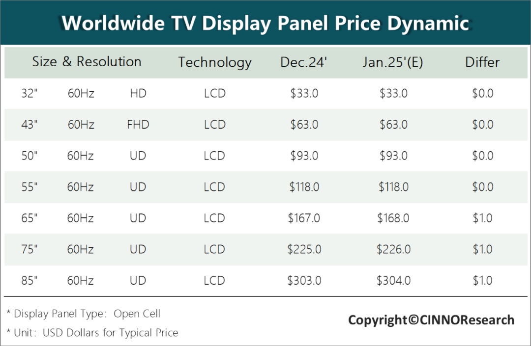 智通财经APP获悉,CINNO Research发文称,2024年12月,国内外促销节日和国内“以旧换新”活动持续进行,市场需求维持在高位,其中,“国补”政策下大尺寸电视需求更为旺盛,65”及以上主流尺寸面板价格开始出现小幅增长,其余尺寸面板价格则趋稳。2025年“国补”政策确定在今年1月实行,继续提振消费市场信心,从供应端来看,考虑到美国加征关税日期临近,12月面板厂出货优先海外订单,而1月供货主要集中在因“国补”延续而增加的国内订单,面板厂或缩短春节休假时间、提高稼动以应对,在供需两端均有支撑的情况下,1月大尺寸面板价格上涨趋势或持续。