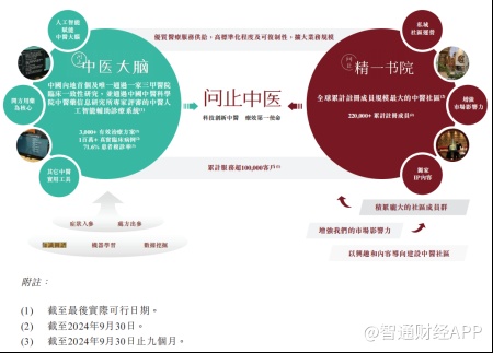 问止中医的中医医疗服务,涵盖在线平台及线下诊所提供的全方位中医咨询、处方、治疗及随访服务。公司通过自营的煎药中心提供高质量煎药服务。公司将中医医疗服务战略性地划分为三个实践领域,即:癌重症;疑难症及全科。截至2024年9月30日,公司已制定逾3000多类病症的有效疾病治疗方案,积累超过一百万例真实临床病例。所有上述真实临床病例均有随访数据标记。