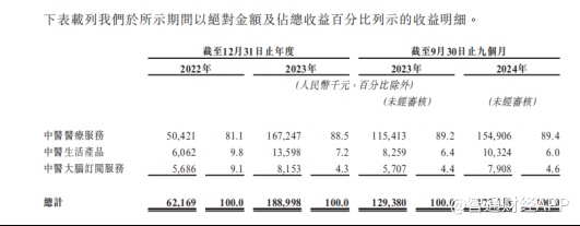 业务方面,问止中医通过中医医疗服务;中医生活产品(包括各种中医养生产品、在线录制课程及书籍);中医大脑订阅服务三大业务产生收入。其中,中医医疗服务作为主要收入来源,在2022年、2023年及2024年前三季度,分别占总收入的81.1%、88.5%和89.4%。
