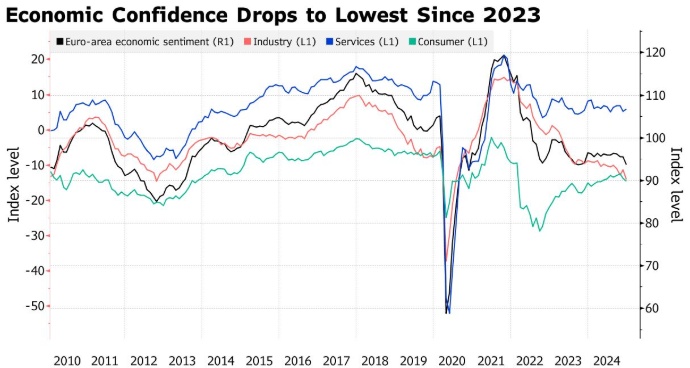 在所有这些不确定性中,欧盟委员会计算的一项经济信心指标在去年12月跌至2023年以来的最低水平。本周公布的数据可能显示,德国经济在2024年将连续第二年收缩。