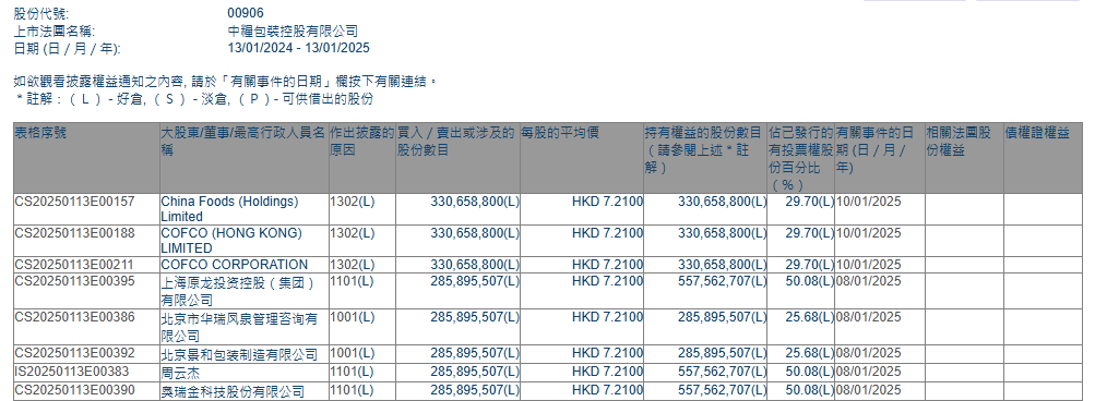 智通财经APP获悉,香港联交所最新资料显示,1月8日,奥瑞金重大资产收购中粮包装(00906)2.86亿股,每股作价7.21港元,总金额为20.61亿港元。收购后最新持股数目为5.58亿股,最新持股比例为50.08%。