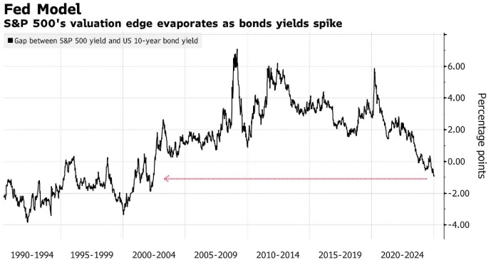原因很简单:债券收益率上升使美国国债的回报更具吸引力,同时也增加了企业的融资成本。标普500指数的收益率比10年期美国国债收益率低1个百分点,上一次出现这种情况是在2002年。换句话说,持有风险远低于美国基准股票的资产的回报,在很长一段时间内都没有这么好。