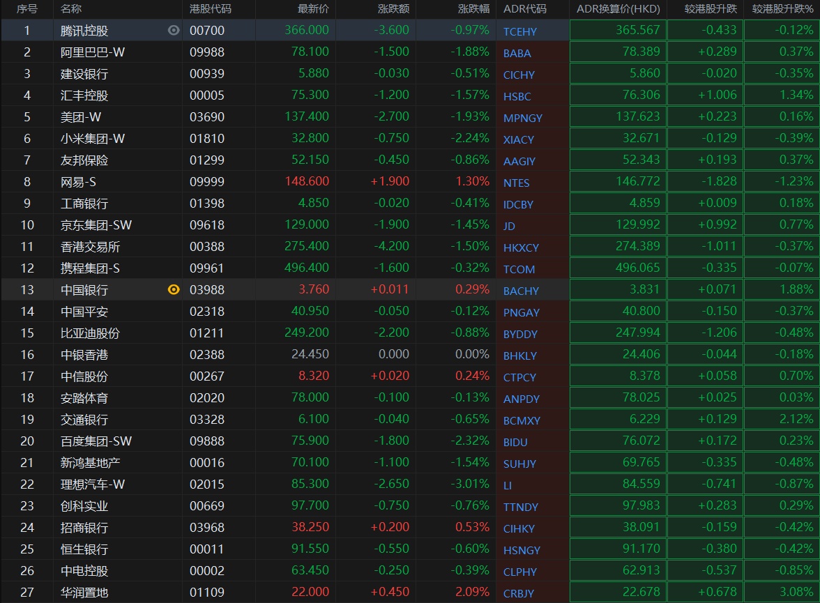 大型蓝筹股涨跌不一,汇丰控股收报76.306港元,较香港收市涨1.34%;腾讯控股收报365.567港元,较香港收市跌0.12%。