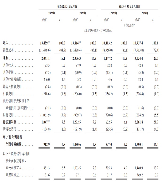 财务方面,公司于2022年、2023年及2024年截至9月30日止九个月,分别录得收入134.9亿元(人民币,下同)、138.15亿元、109.37亿元;对应同期,公司实现期内利润分别约为9.13亿元、10.81亿元、17.9亿元。