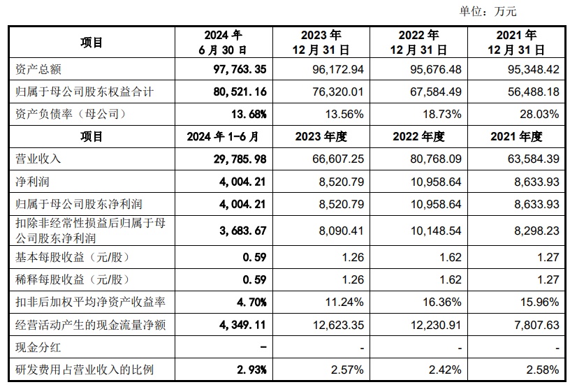财务方面,于2021年度、2022年度、2023年度、2024年1-6月,肯特催化实现营业收入分别约为6.36亿元、8.08亿元、6.66亿元、2.98亿元。同期,该公司实现净利润分别约为8633.93万元、1.1亿元、8520.79万元、4004.21万元。