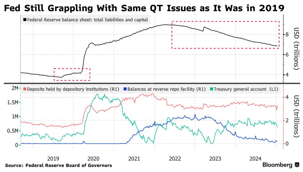 早在2019年,量化紧缩导致的储备稀缺,加上大笔企业税缴纳和国债拍卖结算等多种因素共同导致了流动性紧缩,导致关键贷款利率飙升,迫使美联储出手干预以稳定市场。