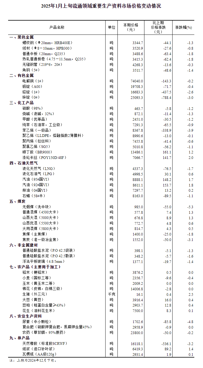 2025年1月上旬流通领域重要生产资料市场价格变动情况